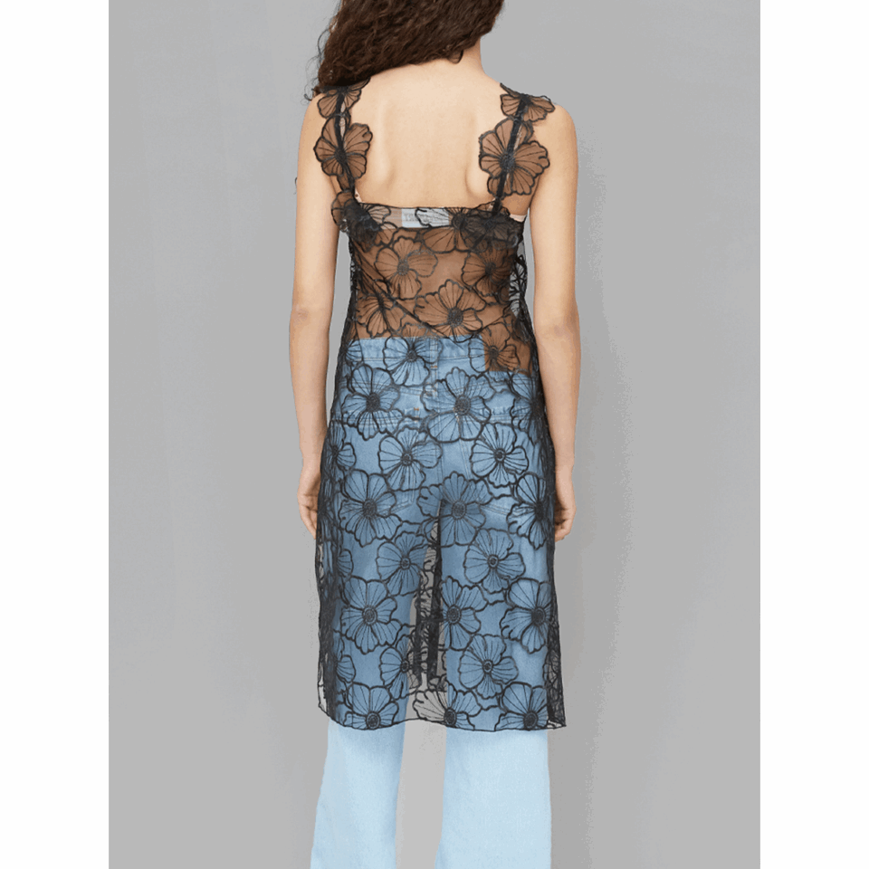 Iris-kjolen er fremstillet af 90% genbrugt polyamid og 10% genbrugt polyester. Den er designet i sort, gennemsigtigt, blomstret blonde, har fine stropper, en løs pasform og en længde til under knæet. Den er let og alsidig og kan styles alene eller som lag over bukser og nederdele for et dristigt, moderne look.