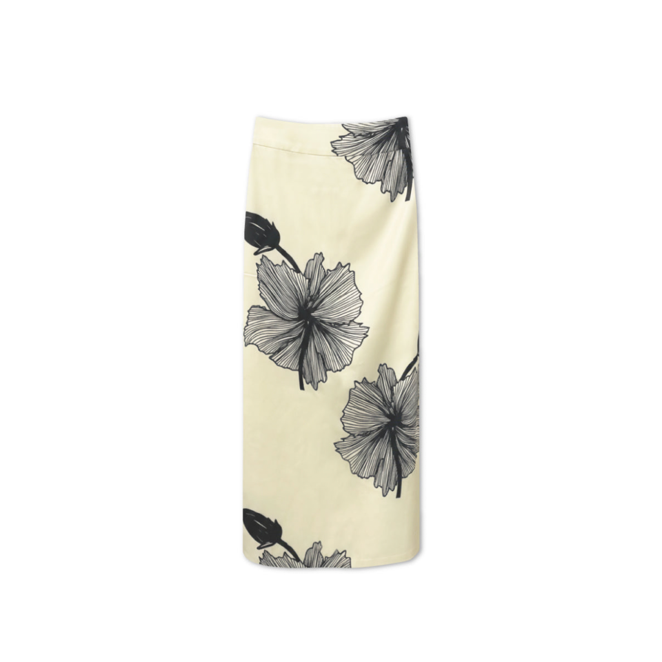 Lone-nederdelen er fremstillet af 100% genbrugspolyester i en blød gul farve og dekoreret med dristige sorte blomsterprint. Den har en læglang silhuet, der sidder behageligt i taljen og har en lige, flagrende form, der skaber et elegant fald. Den er alsidig og raffineret og kan styles alene, kombineres med den matchende Lone Shirt for et elegant look.